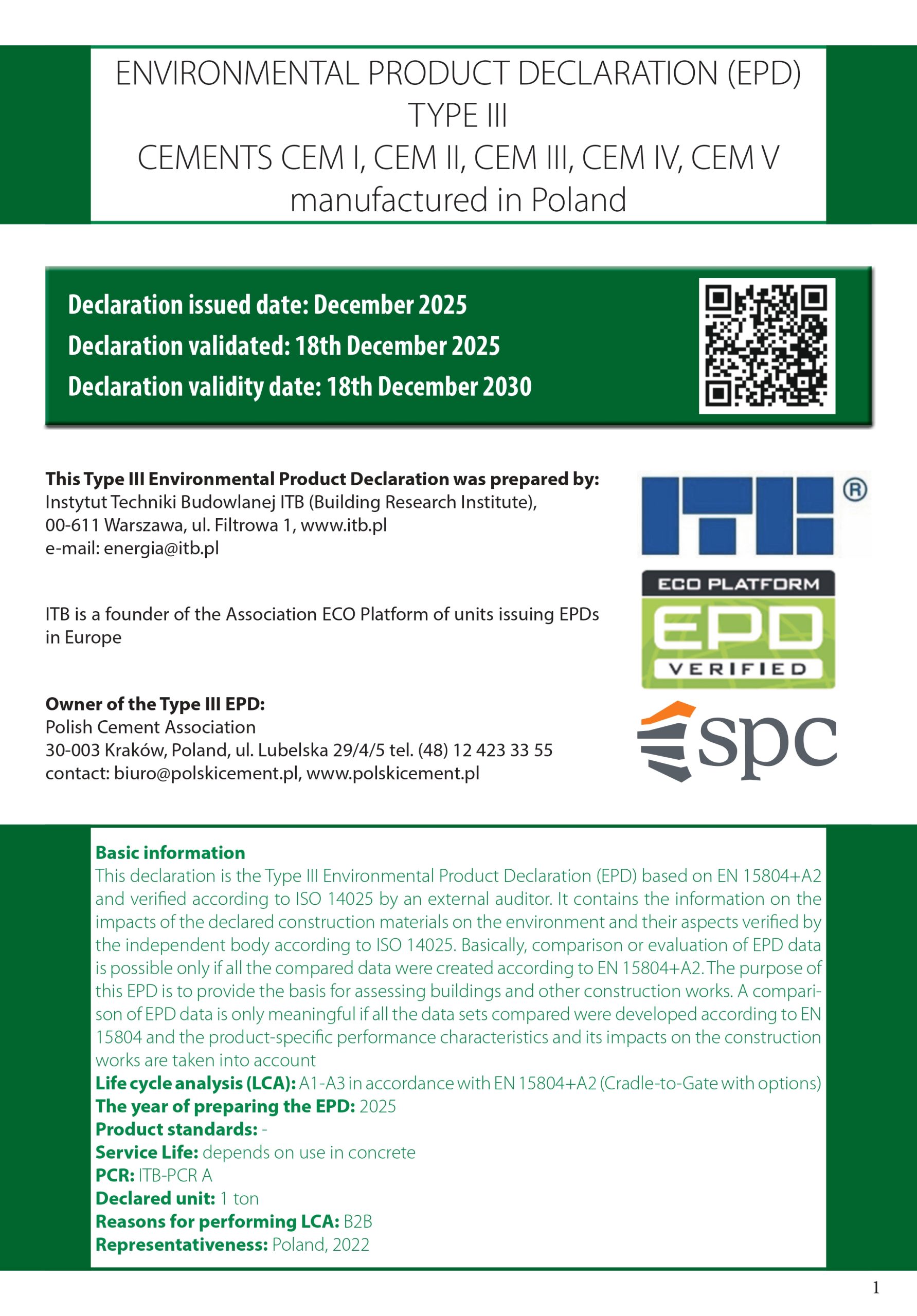 TYPE III ENVIRONMENTAL PRODUCT DECLARATION (EPD) – CEMENTS CEM I, CEM II, CEM III, CEM IV, CEM V produced in Poland
